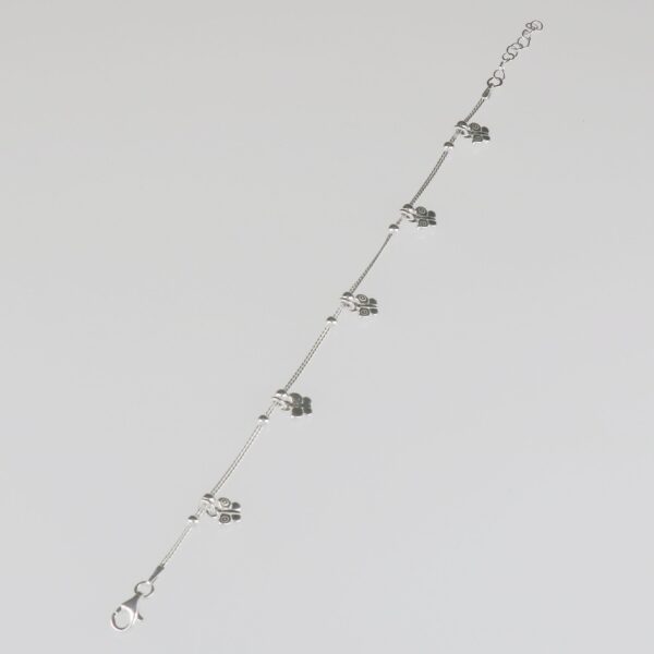 Con bolas lisas de 3 mm, haciendo de separadores de colgantes de mariposas de 7 mm.Pulsera de 16.5 cm de largo y 3 cm de alargador. Plata de ley de 925 milésimas.