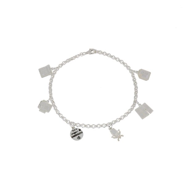 Pulsera rolo 3mm de grosor y 21cm de largo con cinco colgantes relacionados con la administración y una chapa de 10mm con grabado