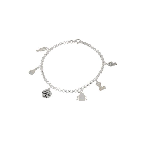 Pulsera rolo 3mm de grosor y 21cm de largo con cinco colgantes relacionados con la carnicería una chapa de 10mm con grabado