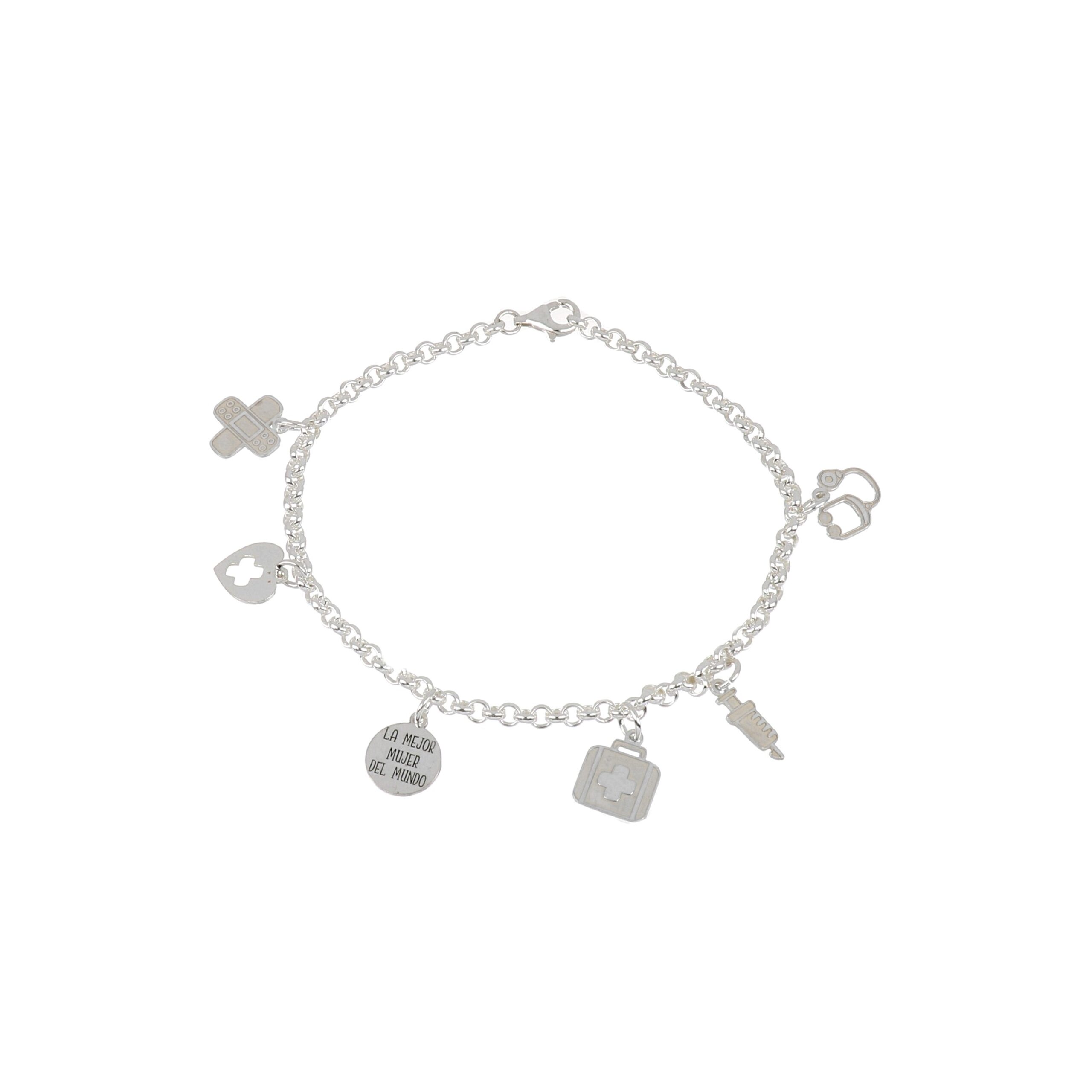 Pulseras, Sin piedrasPulsera rolo 3mm de grosor y 21cm de largo con cinco colgantes relacionados con la enfermería y una chapa de 10mm con grabado