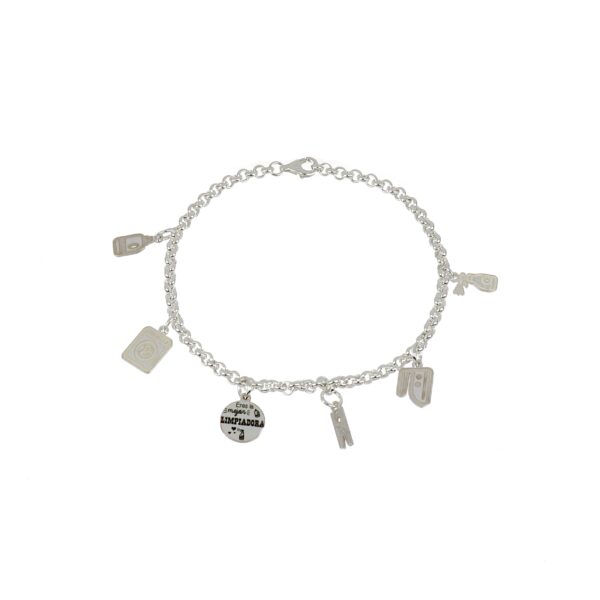 Pulseras, Sin piedrasPulsera rolo 3mm de grosor y 21cm de largo con cinco colgantes relacionados con la limpieza y una chapa de 10mm con grabado