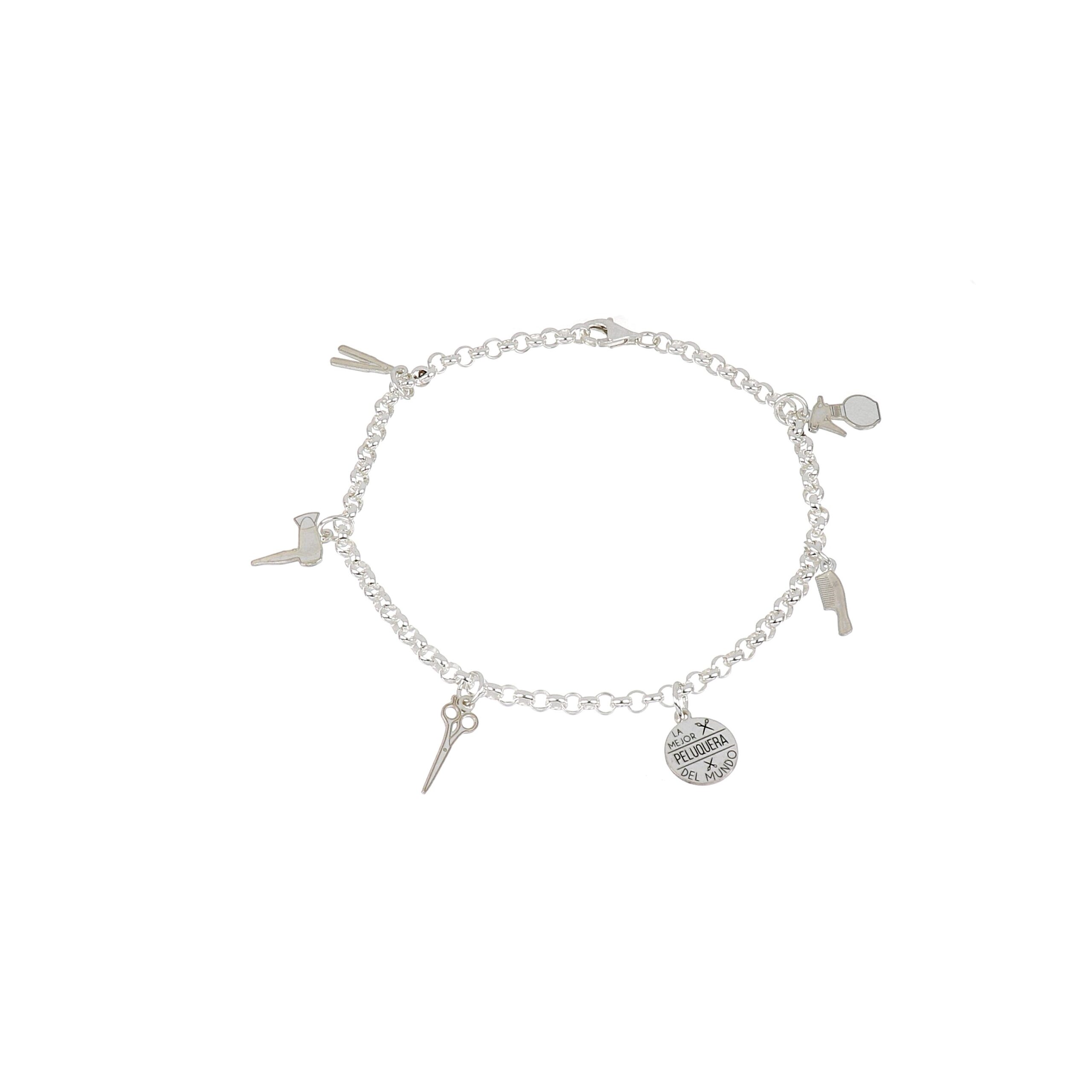 Pulsera rolo 3mm de grosor y 21cm de largo con cinco colgantes relacionados con la peluquería y una chapa de 10mm con grabado La mejor peluquera del mundo