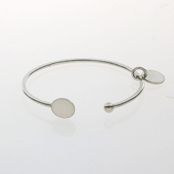 Pulsera de Plata rigida abierta con colgante, bola y disco en los extremos
