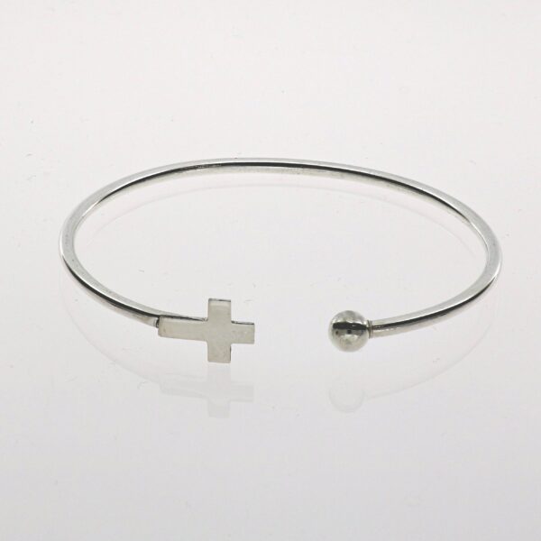Pulsera de Plata rigida abierta, hilo redondo con bola y cruz en los extremos