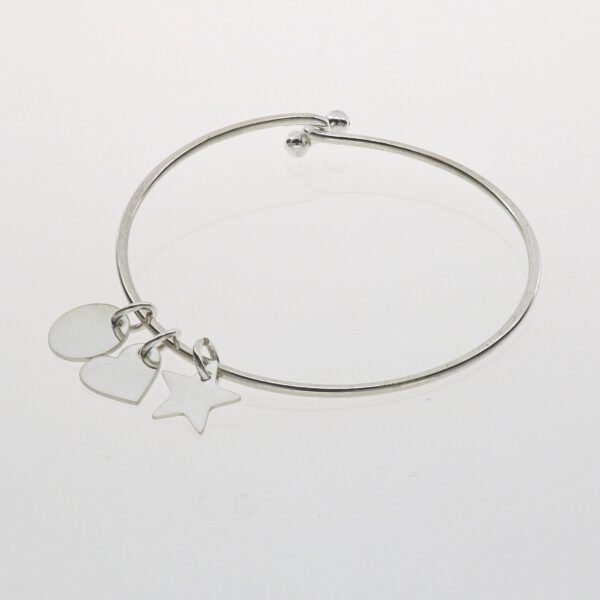 Pulsera de Plata rigida, aro liso con disco,corazon y estrella