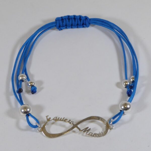 UncategorizedPulsera de hilo doble azul con nudos adaptable, bolas lisas de 6 y 4 mm. Infinito en el centro con te quiero mamá. De 3.5 cm de largo y 1 cm de ancho. Plata de ley de 925 milésimas.