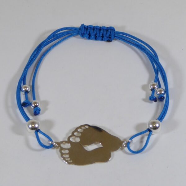 Pulsera de hilo doble azul con nudos adaptable, bolas lisas de 6 y 4 mm.Pies en el centro. De 3 cm de largo y 2 cm de ancho. Plata de ley de 925 milésimas.