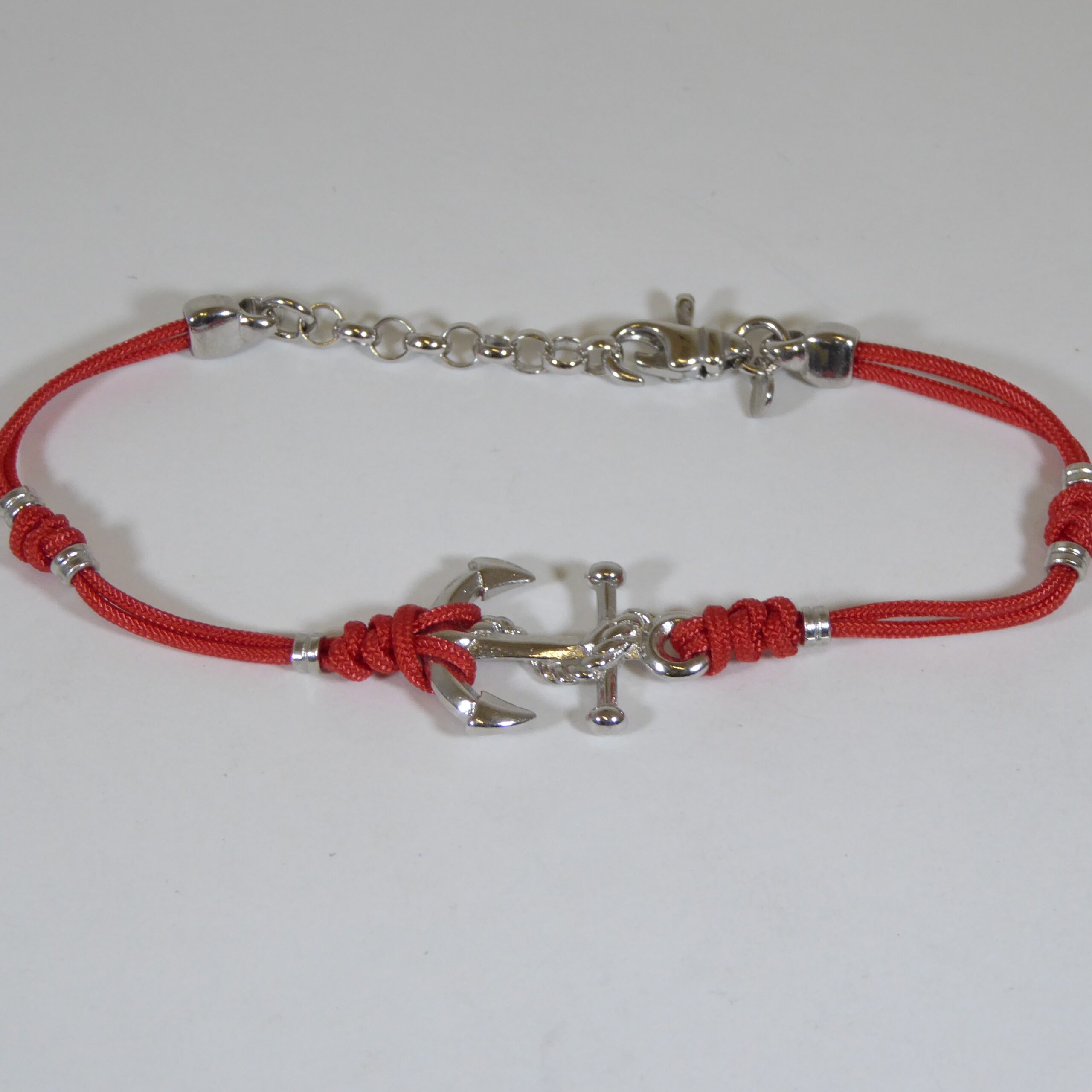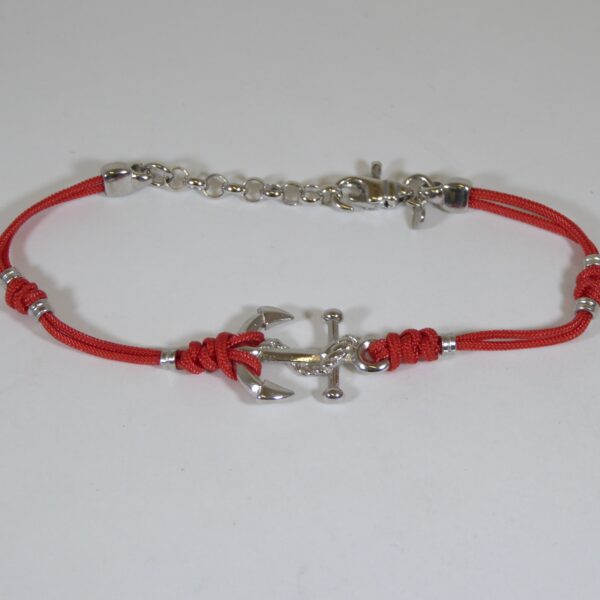 UncategorizedPulsera de hilo doble en rojo con nudos y ancla de 2.5 cm de larga y 1.6 cm de ancha. Pulsera de 18.5 cm de larga y 3 cm de alargador. Plata de ley de 925 milésimas.
