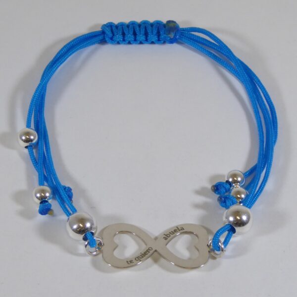 UncategorizedPulsera de hilo doble turquesa con nudos adaptable, bolas lisas de 6 y 4 mm. Infinito en el centro y grabado te quiero abuela. De 2.5 cm de largo y 1 cm de ancho. Plata de ley de 925 milésimas.