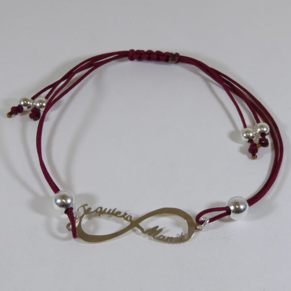 Pulsera de hilo doble burdeos con nudos adaptable, bolas lisas de 6 y 4 mm. Infinito en el centro con te quiero mamá. De 3.5 cm de largo y 1 cm de ancho. Plata de ley de 925 milésimas.