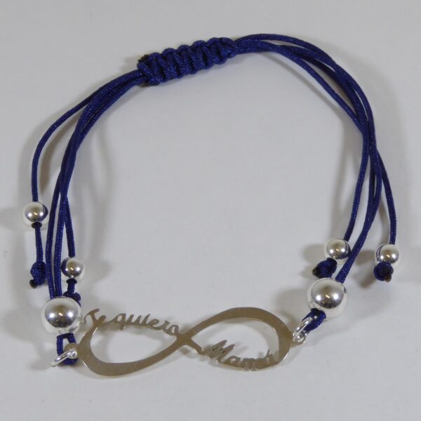 Pulsera de hilo doble azul marino con nudos adaptable, bolas lisas de 6 y 4 mm. Infinito en el centro con te quiero mamá. De 3.5 cm de largo y 1 cm de ancho. Plata de ley de 925 milésimas.