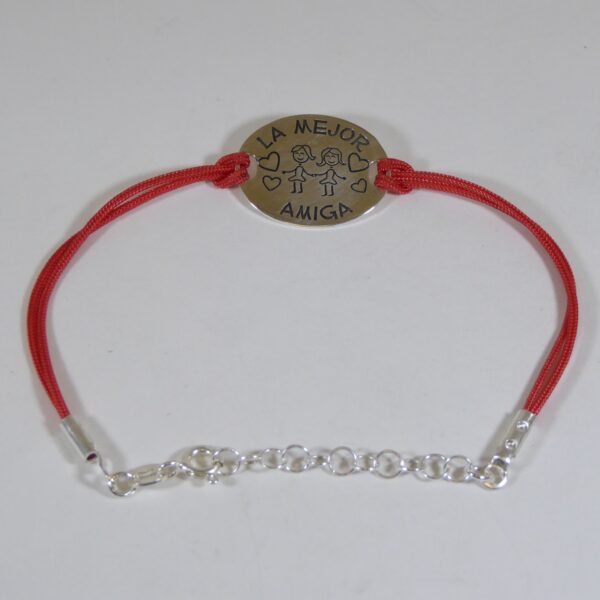 UncategorizedPulsera de hilo doble rojo con placa para la mejor amiga de 1.5 cm de ancho y 2 cm de largo. Pulsera de 16 cm de larga y 3 cm de alargador. Plata de ley de 925 milésimas.