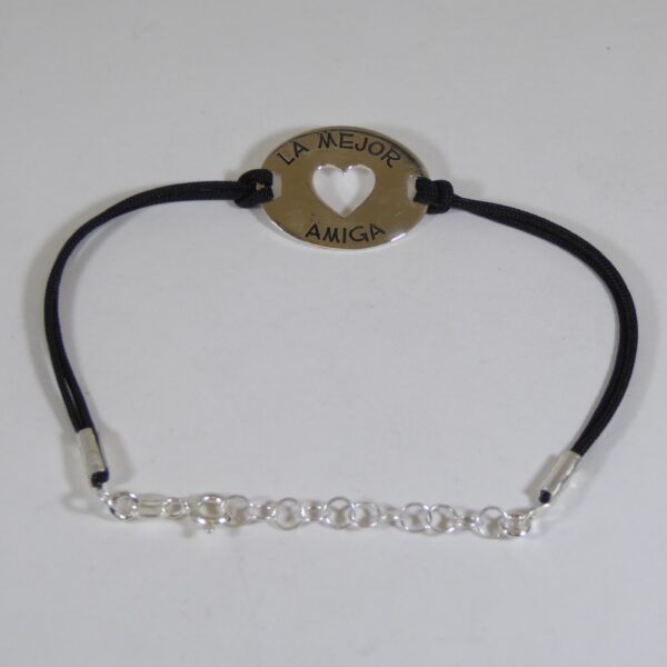UncategorizedPulsera de hilo doble negro con placa para la mejor amiga de 1.5 cm de ancho y 2 cm de largo con corazón hueco . Pulsera de 16 cm de larga y 3 cm de alargador. Plata de ley de 925 milésimas.