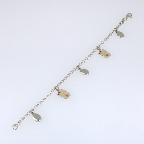 Pulsera con cadena rolo de 3.15 mm , en la que cuelgan gatitas esmaltada de 11.30 mm y figura ovalada hueca.
