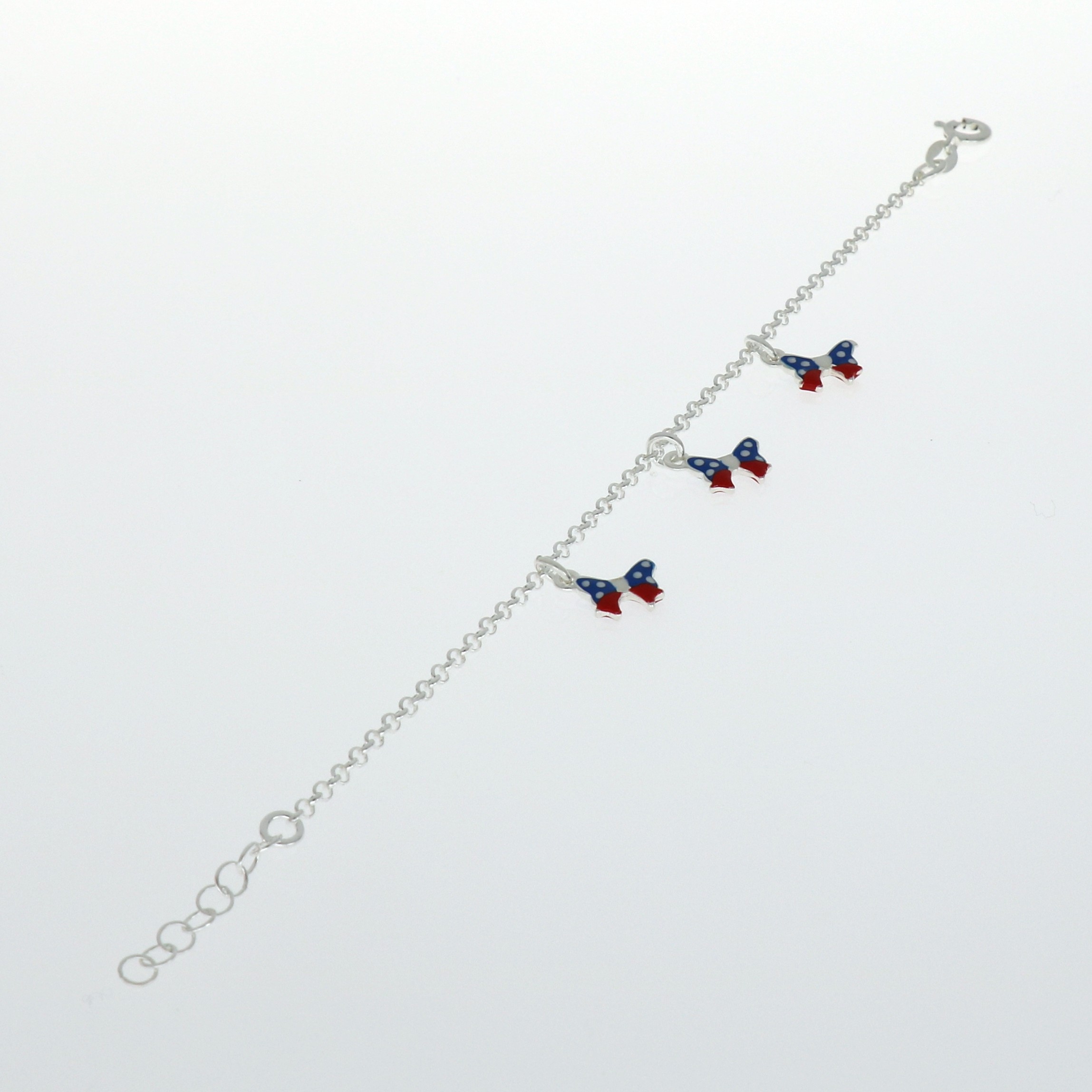 Con tres lazos esmaltadas colgando de 10 mm. Pulsera de 15 cm de largo y 2.5 cm de alargador.