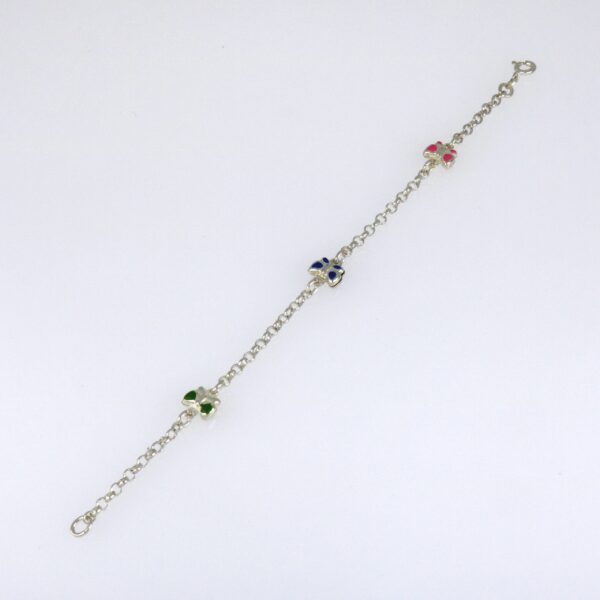 Pulsera con cadena rolo de 2.85 mm y tres mariposas huecas, esmaltadas en diferentes colores.
