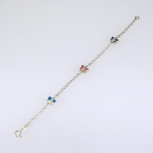 Pulsera con cadena rolo de 2.85 mm y tres mariposas huecas, esmaltadas en diferentes colores.