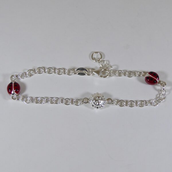 Pulsera infantil con cadena rolo, con mariquitas esmaltadas y un sol liso. 18.5 cm de largo. Plata de ley de 925 milésimas.