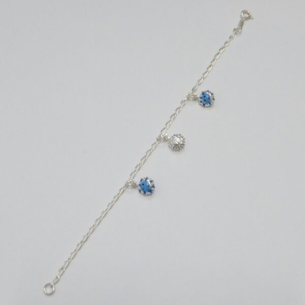 Pulsera infantil con cadena cheval y colgantes de sol esmaltados en celeste.18.5 cm de largo. Plata de ley de 925 milésimas.