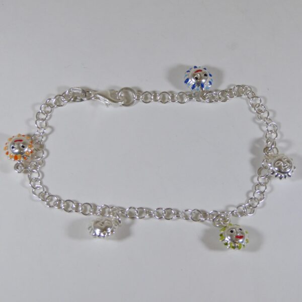 Pulsera infantil de cadena rolo con colgantes de soles esmaltados y lisos.18.5 cm de largo.Plata de ley de 925 milésimas.
