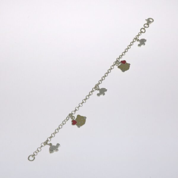 Pulsera con cadena rolo de 3 mm , en la que cuelga tortugas huecas y la cara de la gatita esmaltada de 10.75 mm.