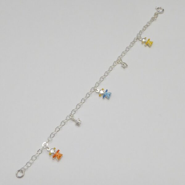 Pulsera infantil con cadena rolo plana. Con colgantes de estrellas lisas y niñas esmaltadas.