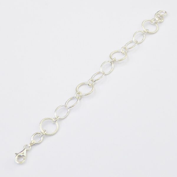 Pulsera de plata de eslabones ovalados lisos y círculos talados.17 cm de largo y 2 cm de alargador. Plata de ley de 925 milésimas.