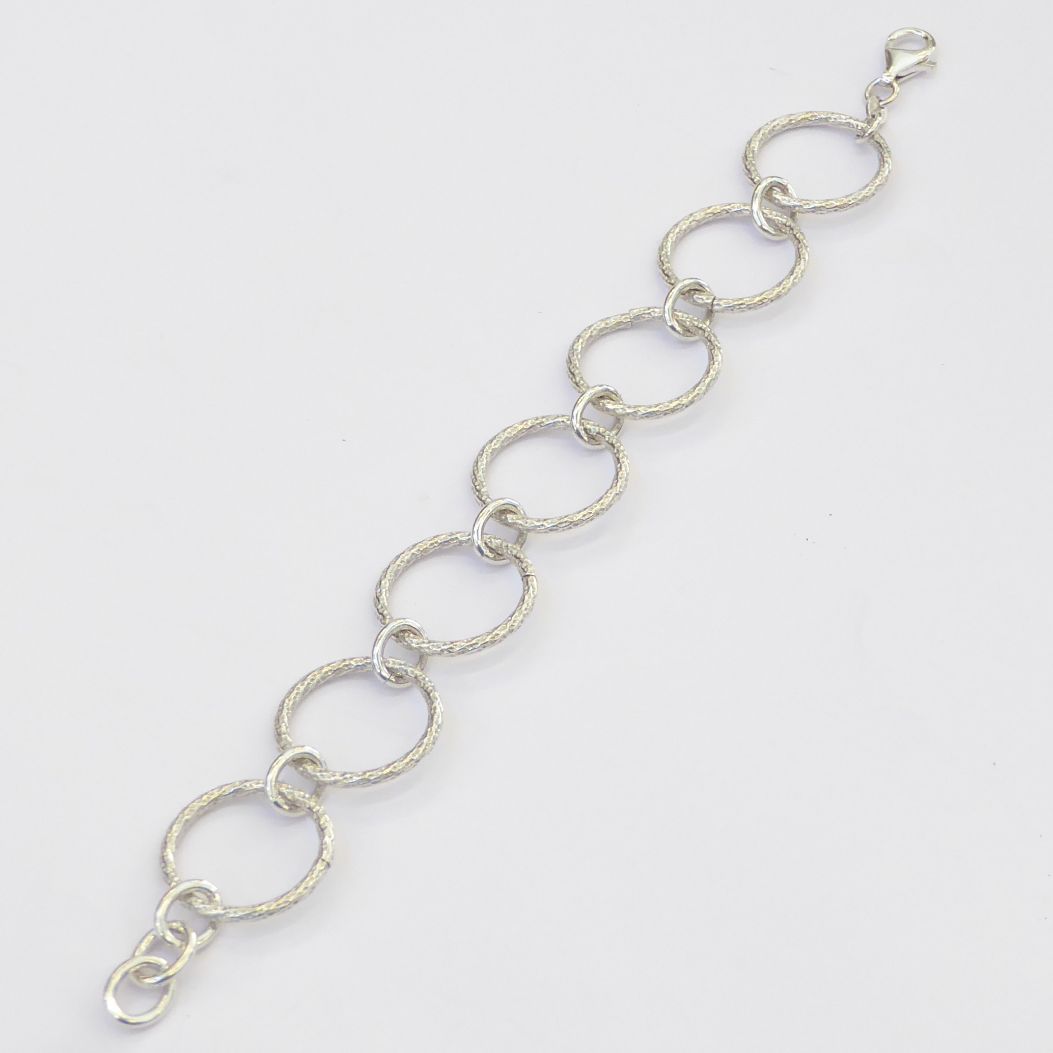 Pulsera hueca con eslabones redondos tallados de 2 cm de diámetro. 18 cm de largo y 2 cm de alargador. Plata de ley de 925 milésimas.