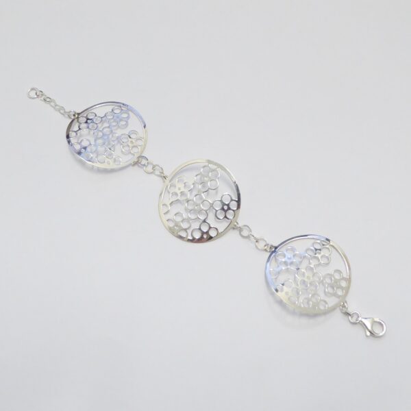 Pulsera con tres circunferencias tallada con motivos de flores,con tumbo y 3.5 cm de diámetro. 19 cm de largo. Plata de ley de 925 milésimas.