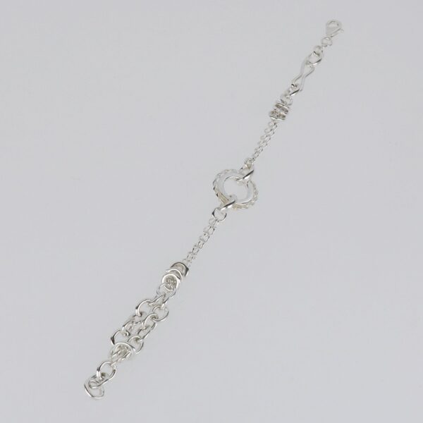 Pulsera hueca que combina cadena rolo con forzada y aros sueltos con un aro en el centro combinando parte lisa y labrada en el exterior de 15.40 mm de diámetro. 18 cm de largo. Plata de ley de 925 milésimas.