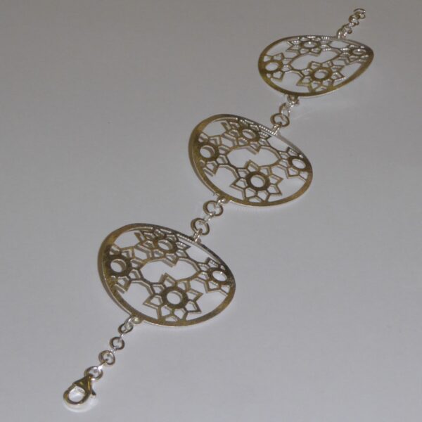 Pulseras, Sin piedrasPulsera con tres circunferencias tallada con motivos de flores,con tumbo y 3.5 cm de diámetro. 19 cm de largo. Plata de ley de 925 milésimas.