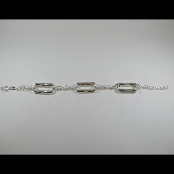 Pulsera de rolo doble con eslabones rectangulares huecos. De 4.15 mm de grosor , 2.5 cm de largo y 1.5 cm de ancho. Pulsera de 18.5 cm de largo y 3 cm de alargador. Plata de ley de 925 milésimas.