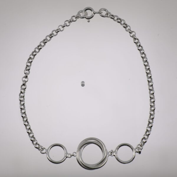 UncategorizedPulsera de cadena rolo 2.5 mm de grosor. Combinando aros lisos y trenzado ,de 8.25 y 13 mm de diámetro en el centro. 19 cm de largo. Plata de ley de 925 milésimas.