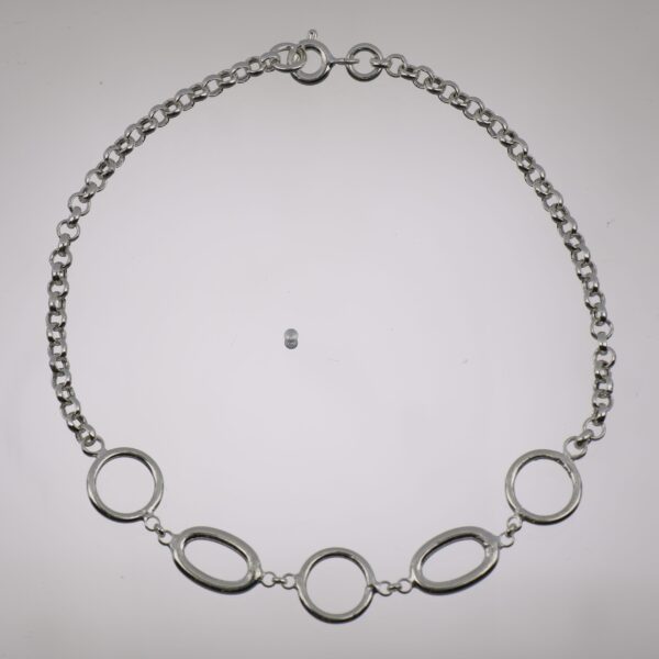 Pulsera de cadena rolo 2.5 mm de grosor. Combinando aros lisos de 8.30 de diámetro y ovalados de 10 mm de largo y 5 mm. Pulsera de 19 cm de largo. Plata de ley de 925 milésimas.