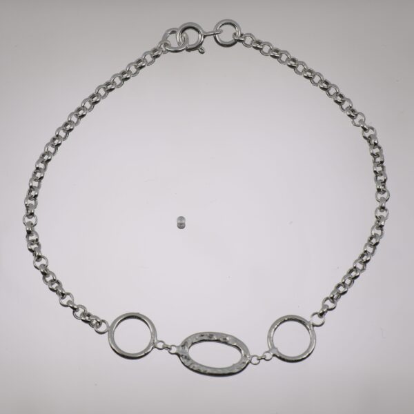 Pulsera de cadena rolo 2.5 mm de grosor. Combinando aros lisos de 8.20 de diámetro y ovalados tallado de 10 mm de largo y 7.5 mm de ancho. Pulsera de 18 cm de largo. Plata de ley de 925 milésimas.