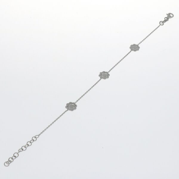 UncategorizedPulsera rodiada con cadena rolo de 1 mm y tres flores intercaladas.