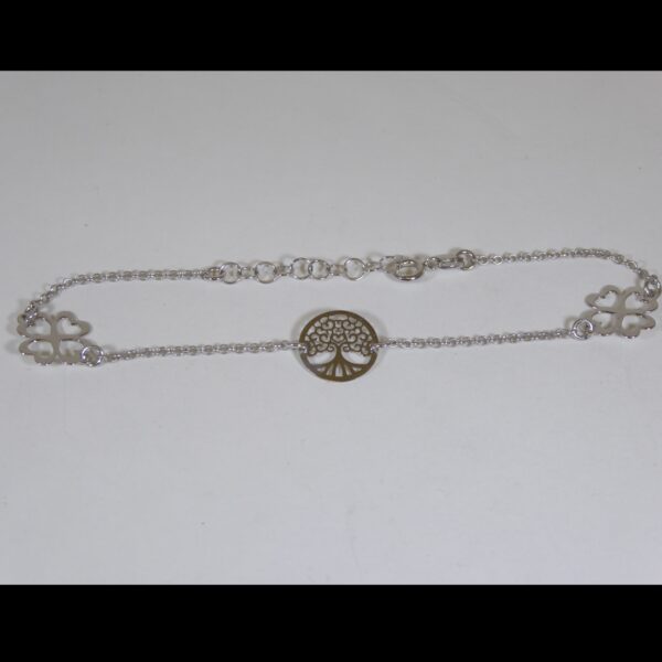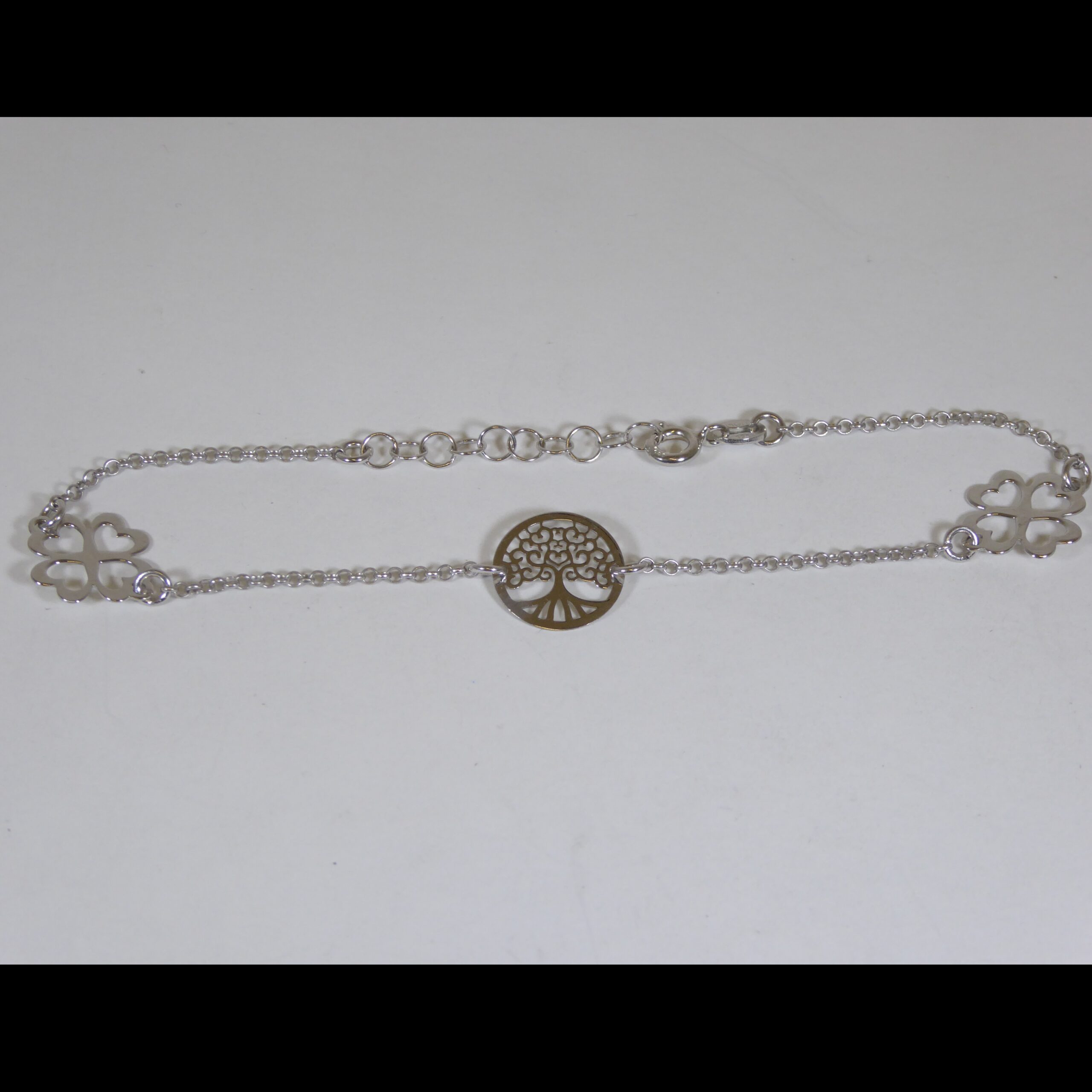 Pulsera de cadena de rolo de 2 mm de grosor tréboles de corazones 11 mm y árbol de la vida en el centro de 12 mm. 18 cm de largo y 3 cm de alargador. Plata de ley de 925 milésimas.
