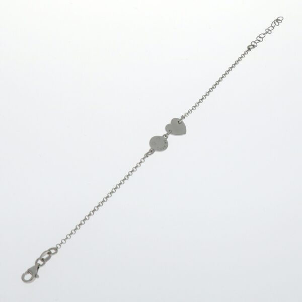 Pulsera rodiada con cadena rolo de 2 mm. Corazón y plaquita con love me de 8.30 mm.