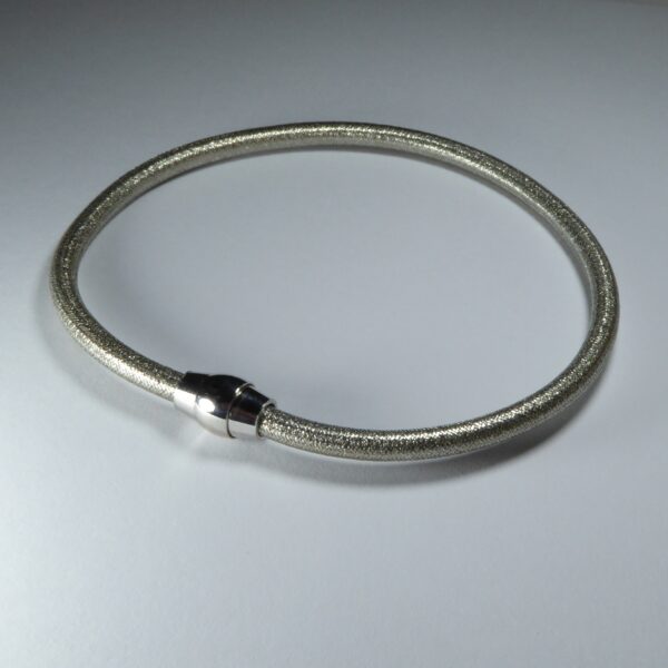 Pulsera lisa rodiada satinada. De 3 mm de diámetro y 19.5 cm de largo. Con cierre de imán. Plata de ley de 925 milésimas..