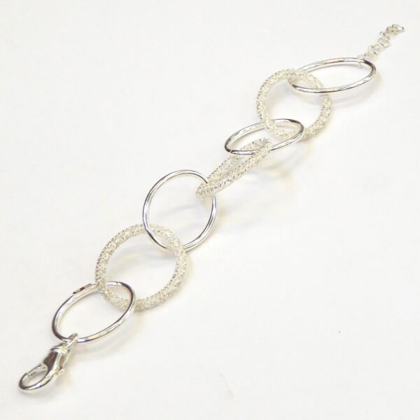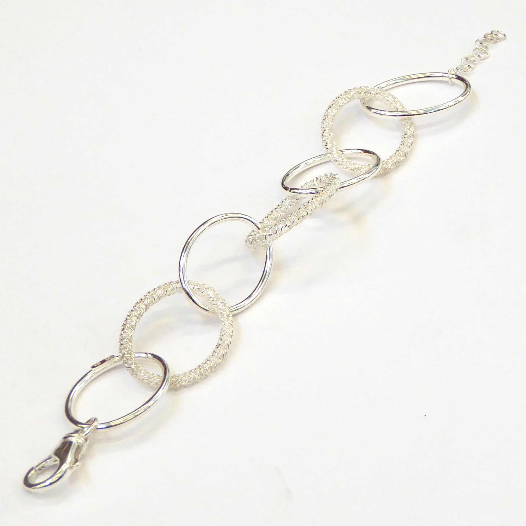 Pulsera asas hueca lisa combinada con asa de malla rígida. 19 cm de largo y 3 cm de alargador. Plata de ley de 925 milésimas.