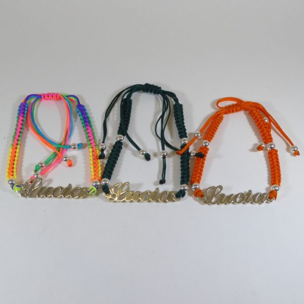UncategorizedPulsera adaptable de macrame, diferentes colores con el nombre de Lucía. De 4 cm de largo y 7 mm de ancho. Pulsera de plata de ley con 925 milésimas.