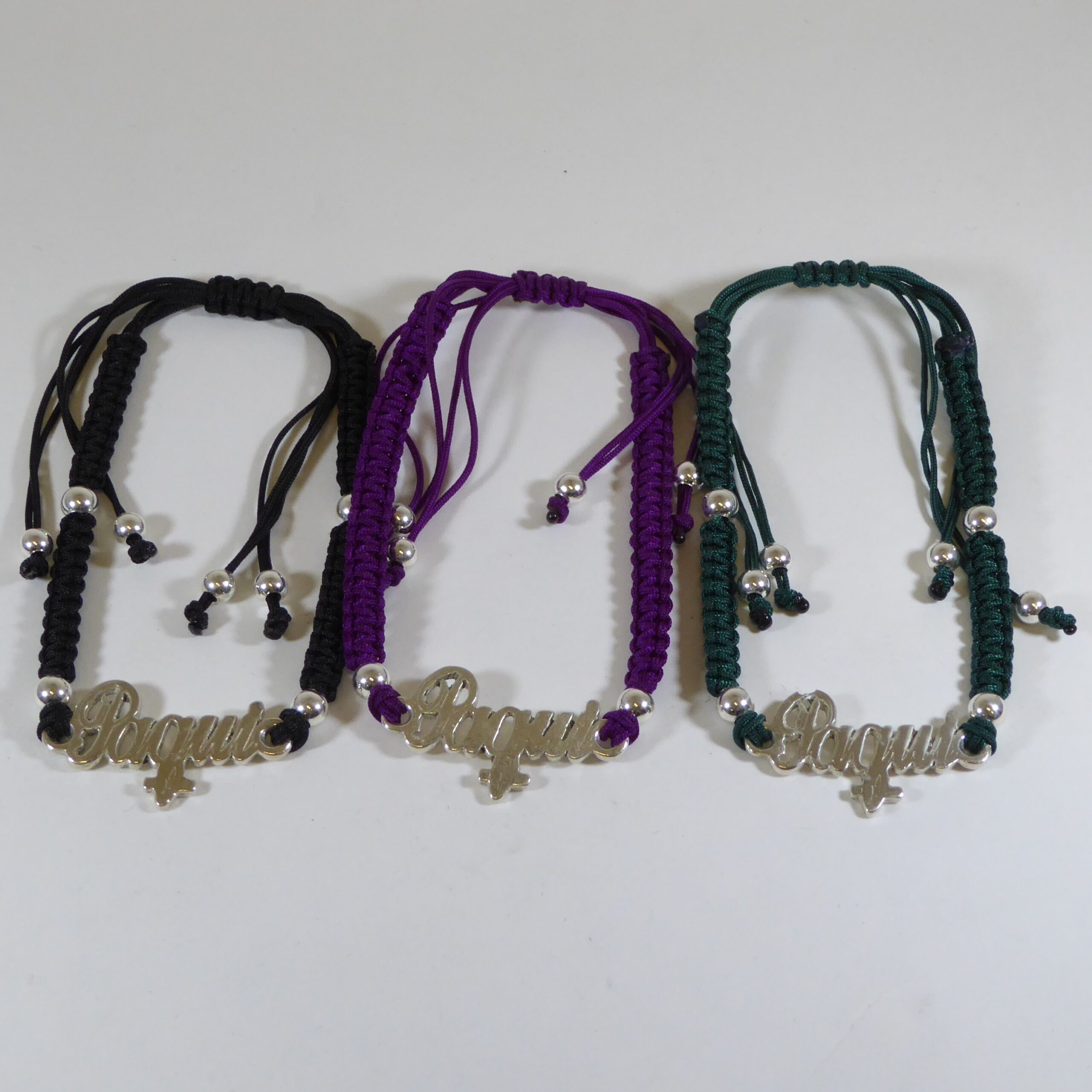 Pulsera adaptable de macrame, diferentes colores con el nombre de Paqui. De 3.5 cm de largo y 7 mm de ancho. Pulsera de plata de ley con 925 milésimas.