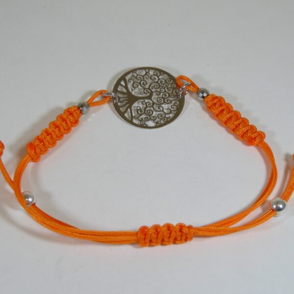 UncategorizedPulsera ajustable de macrame. Hilo doble naranja con árbol de la vida de 2 cm de diámetro. Pulsera de 16 cm de larga y 3 cm de alargador. Plata de ley de 925 milésimas.