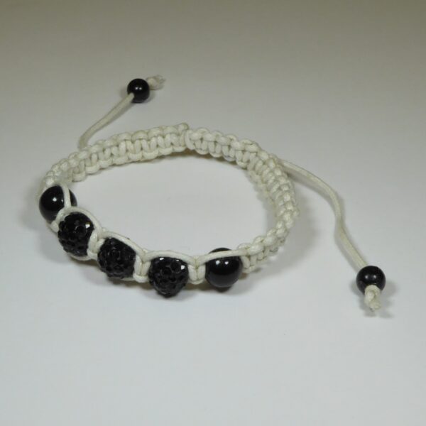 Pulsera de macrame con hilo blanco y bolas negras, lisas y con circonitas negras. 18 cm a 20 cm de largo.