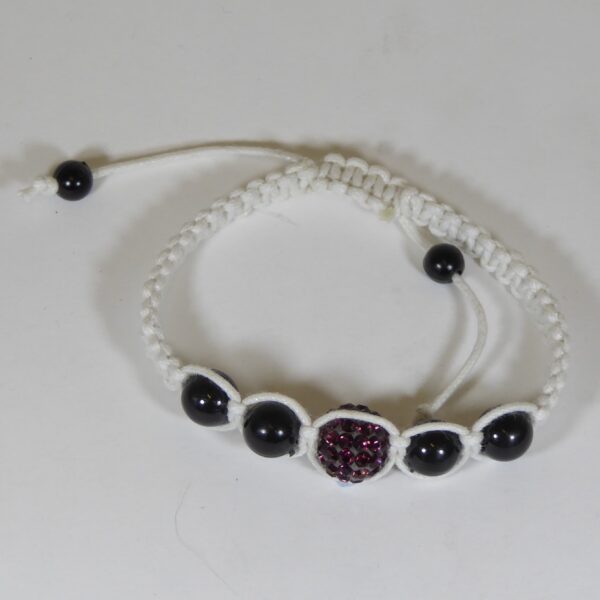 Pulsera de macrame con hilo blanco y bolas negras, lisas y con circonitas rosa al centro. 18 cm a 20 cm de largo.