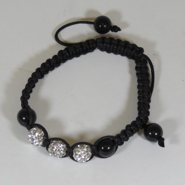Pulsera de macrame con hilo negro y bolas negras lisas y blancas con circonitas . 16 cm a 20 cm de largo.