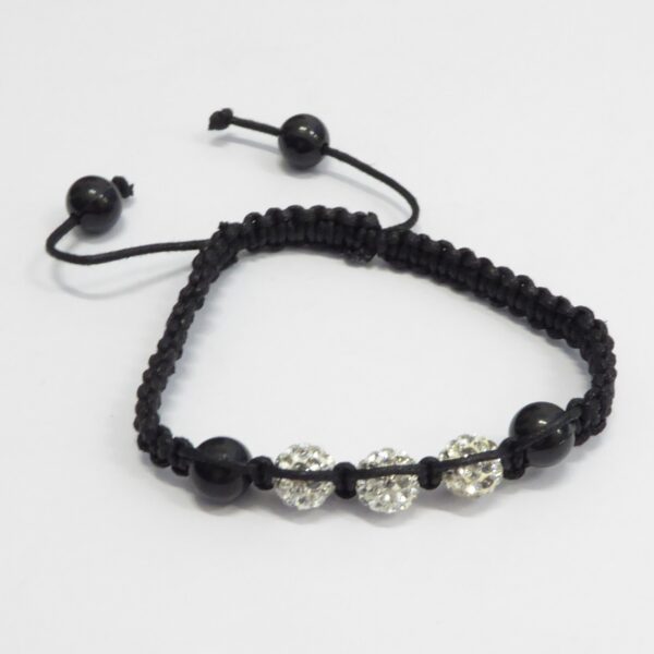 Pulsera de macrame con hilo negro y bolas negras lisas y blancas con circonitas . 16 cm a 20 cm de largo.