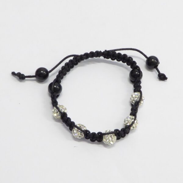 Pulsera de macrame con hilo negro y bolas negras, lisas y con circonitas blancas. 18 cm a 20 cm de largo.