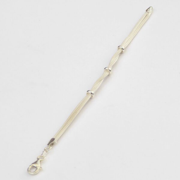 Pulsera de malla doble trenzada al centro con tres separadores. 19.5 cm de largo. Plata de ley de 925 milésimas.