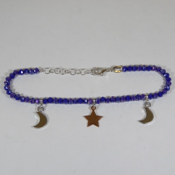 Pulsera de piedras facetada morada.Con colggante de lunas y estrella chapada en rosa de 10 mm . 16 cm de largo y 3 cm de alargador. Plata de ley de 925 milésimas.